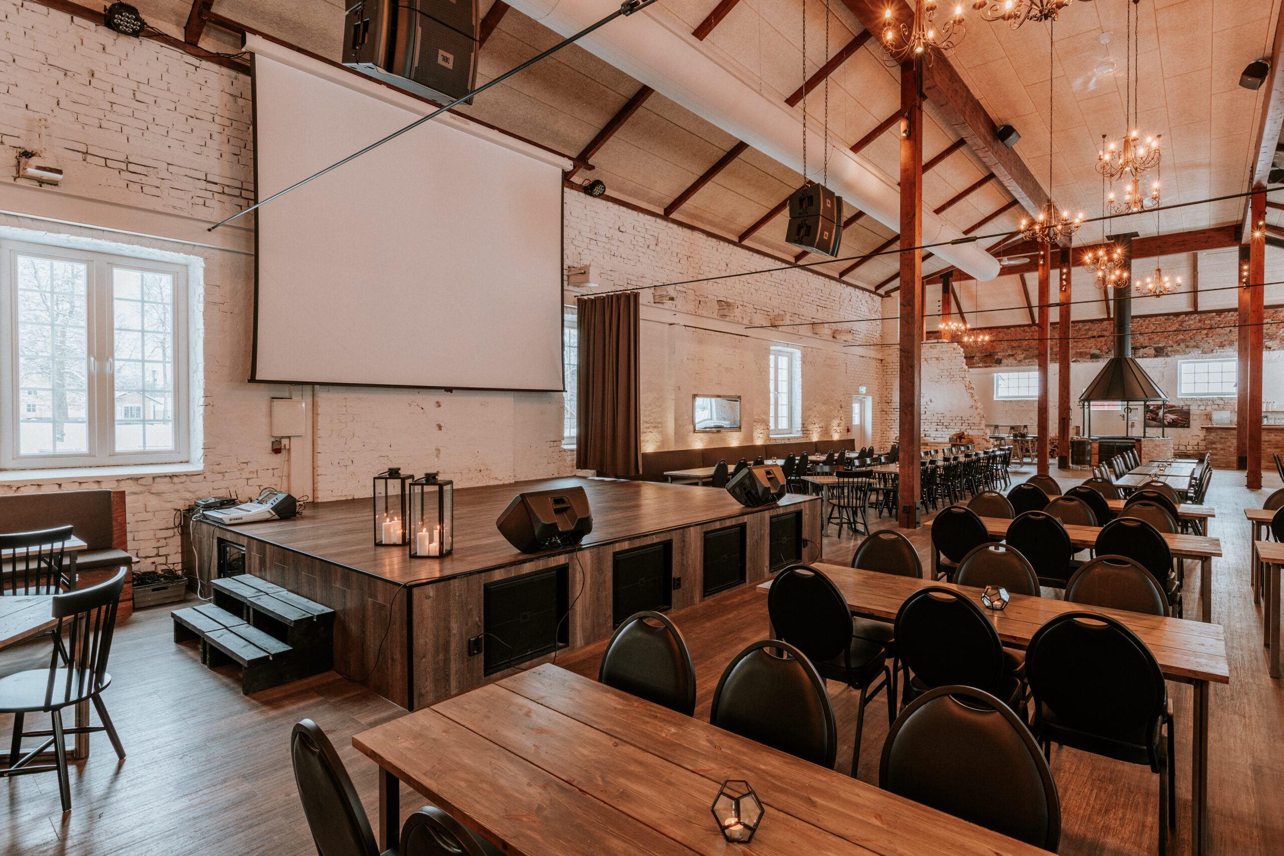 Stallet är vår största lokal, inrymd i ett varsamt renoverat stall från 1800-talet. Lokalen omfattar cirka 800 kvm och har scen, bar, restaurangkök, toaletter och kapprum. Här kan vi ta emot upp till 450 personer i biosittning för konferenser eller cirka 300 personer vid middagssittning.